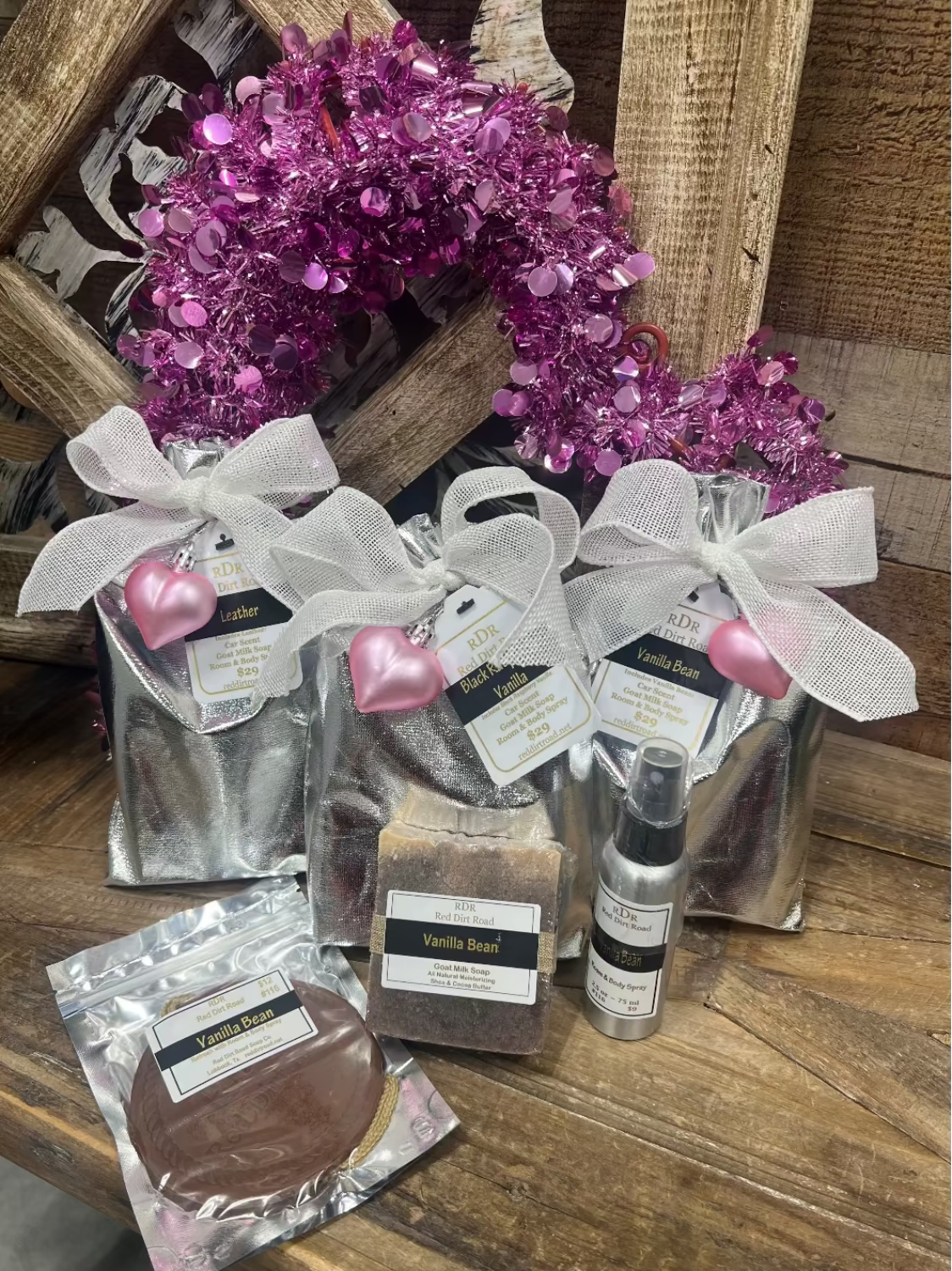Gift bag includes: 1 car scent, 1 goat milk soap(6oz.), and 1 Room & Body Spray(2.5oz.)