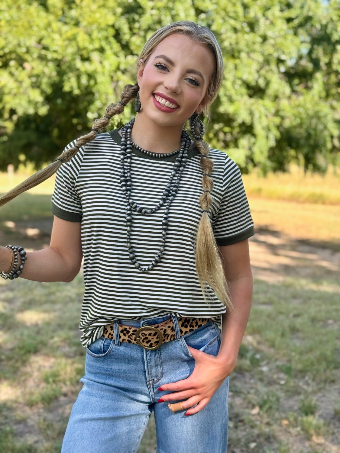 Olive green and cream stripes with olive ribbed trim around the neckline and sleeves