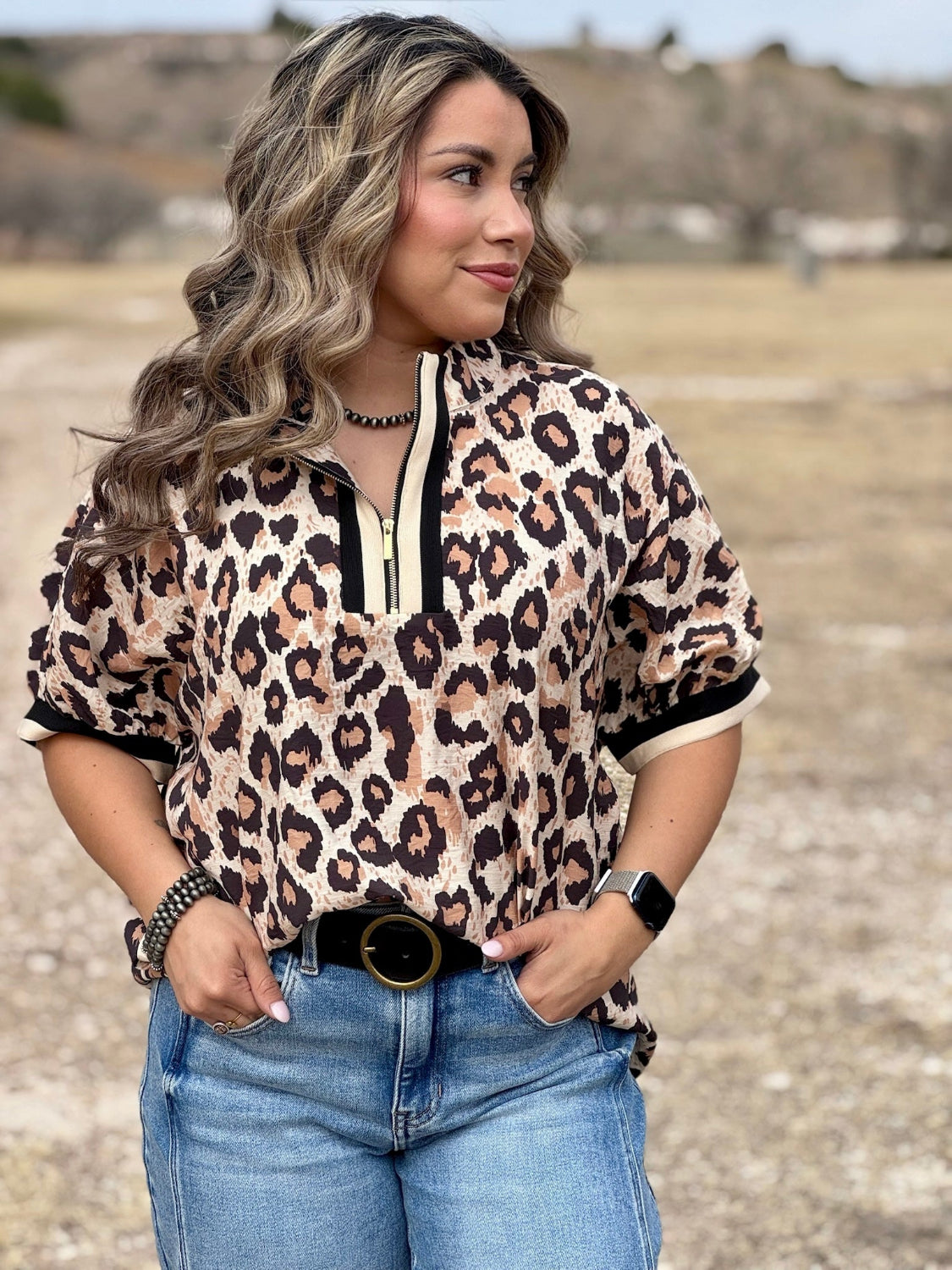 Take a walk on the wild side, darlin’! This beauty features a gorgeous leopard print with a bold striped trim split neckline that adds just the right pop of color and style.