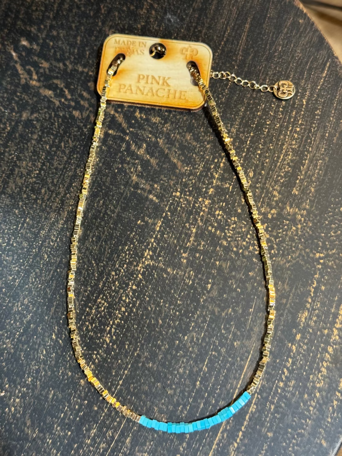 This necklace is the perfect addition to your outfit, offering a polished look. Features small gold and turquoise beads, adding a touch of color and elegance.