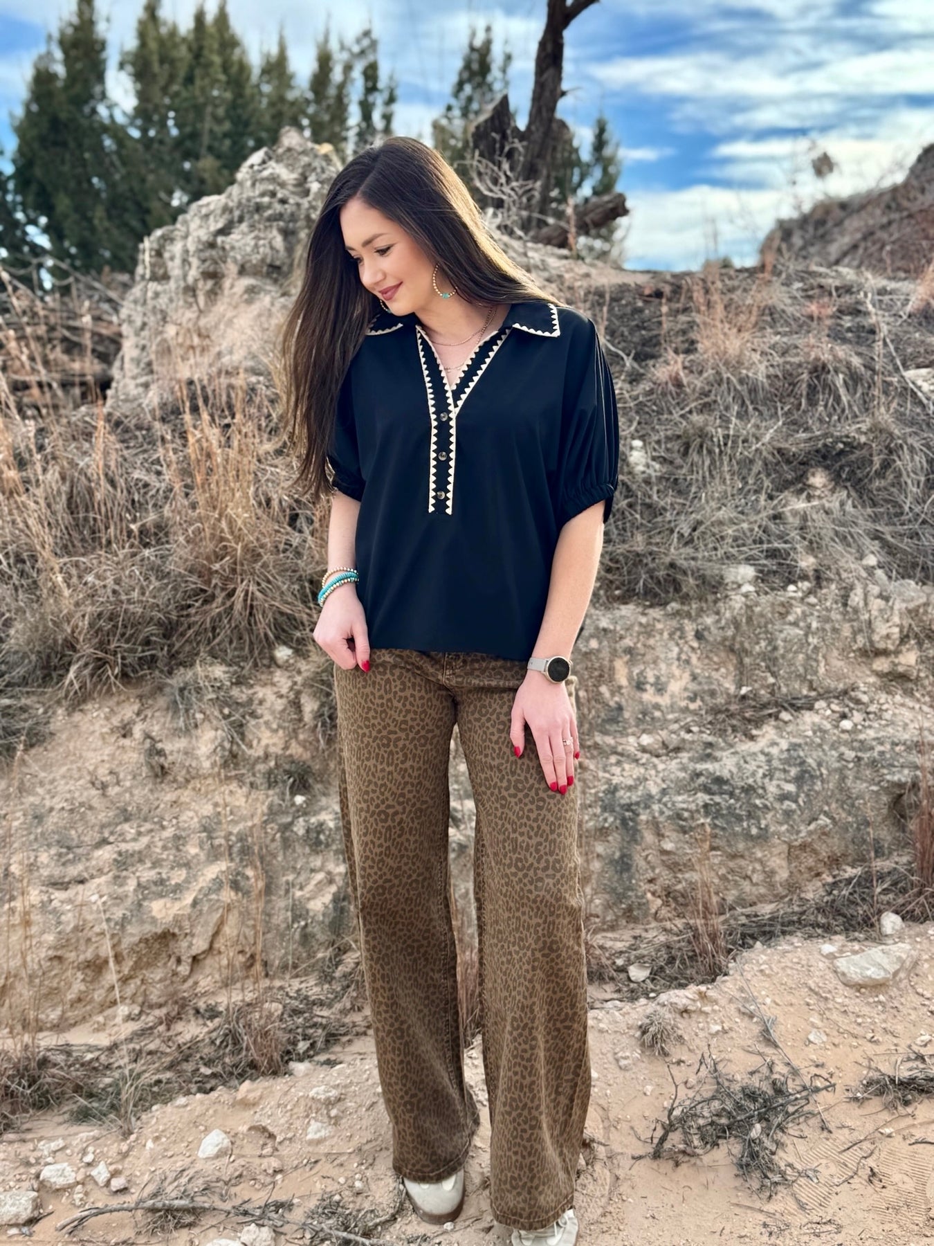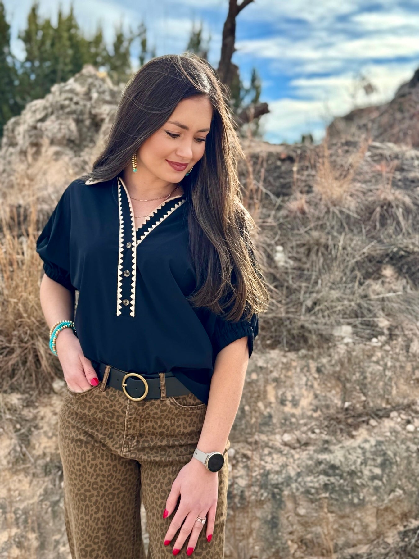 • A classic silhouette with the prettiest details, this blouse will keep you looking sharp and fun all day long!