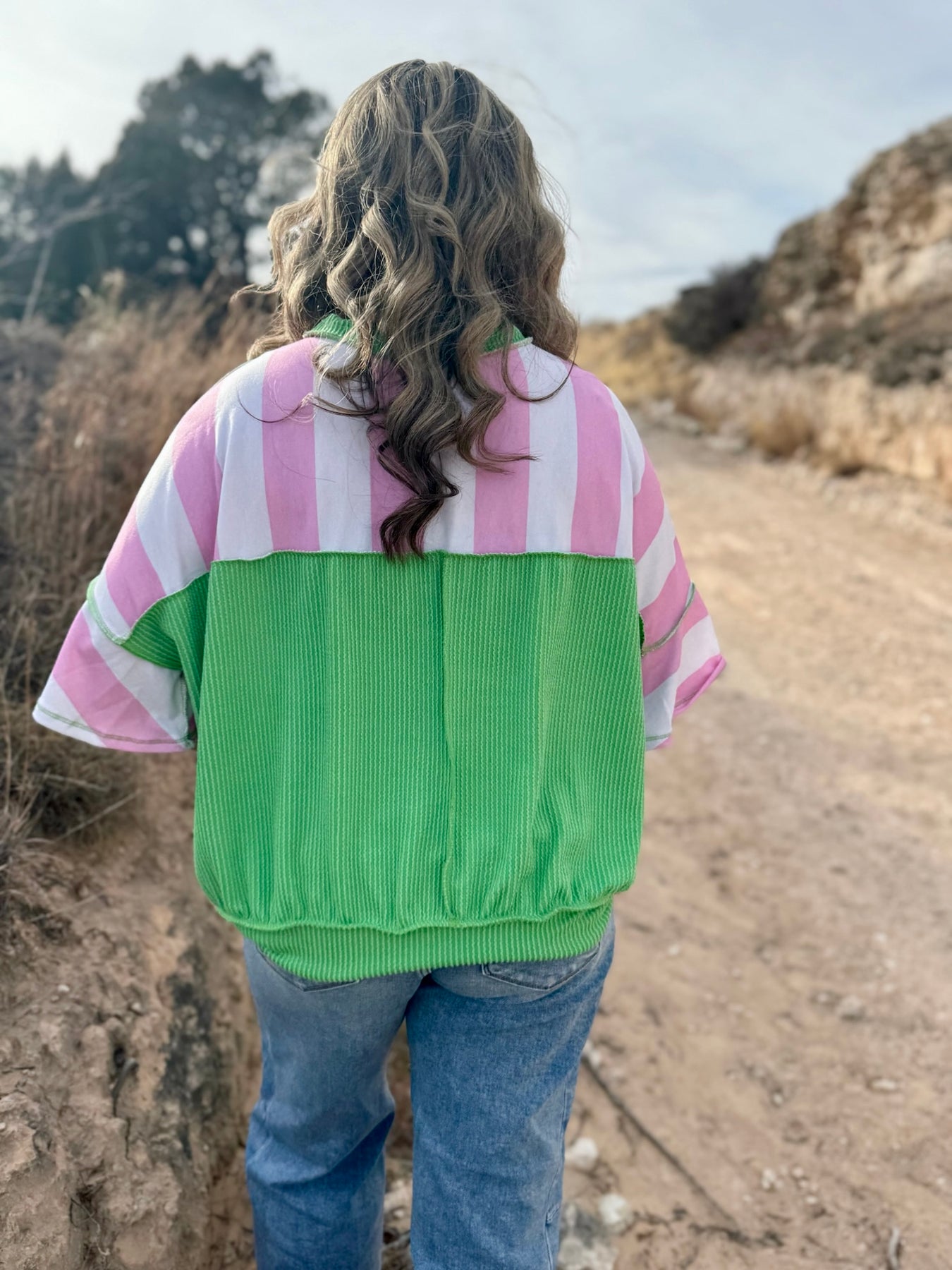 Designed with a relaxed, oversized fit, this top features soft French terry fabric with playful mint and blush color-block stripes that feel fresh and feminine.