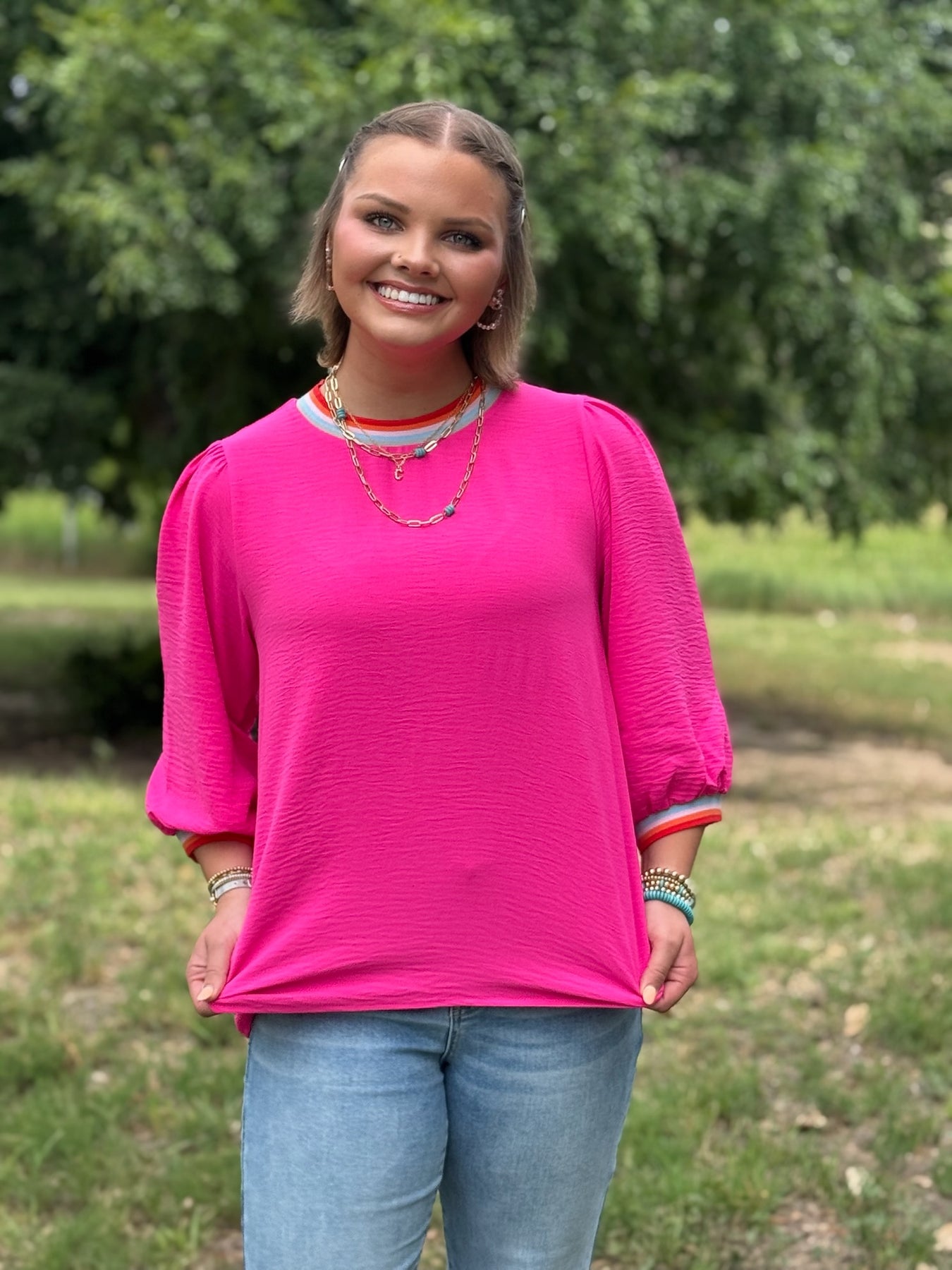 The vibrant striped ribbing at the neckline and sleeve ends adds a fun contrast, making this top a standout choice for casual days. Made with a lightweight, non-sheer fabric, it ensures comfort and ease.