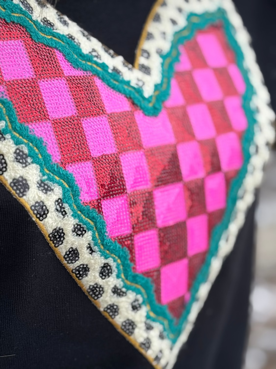 Statement patchwork heart with layered textures, checkered details, and a playful mix of pinks and bold accents.
