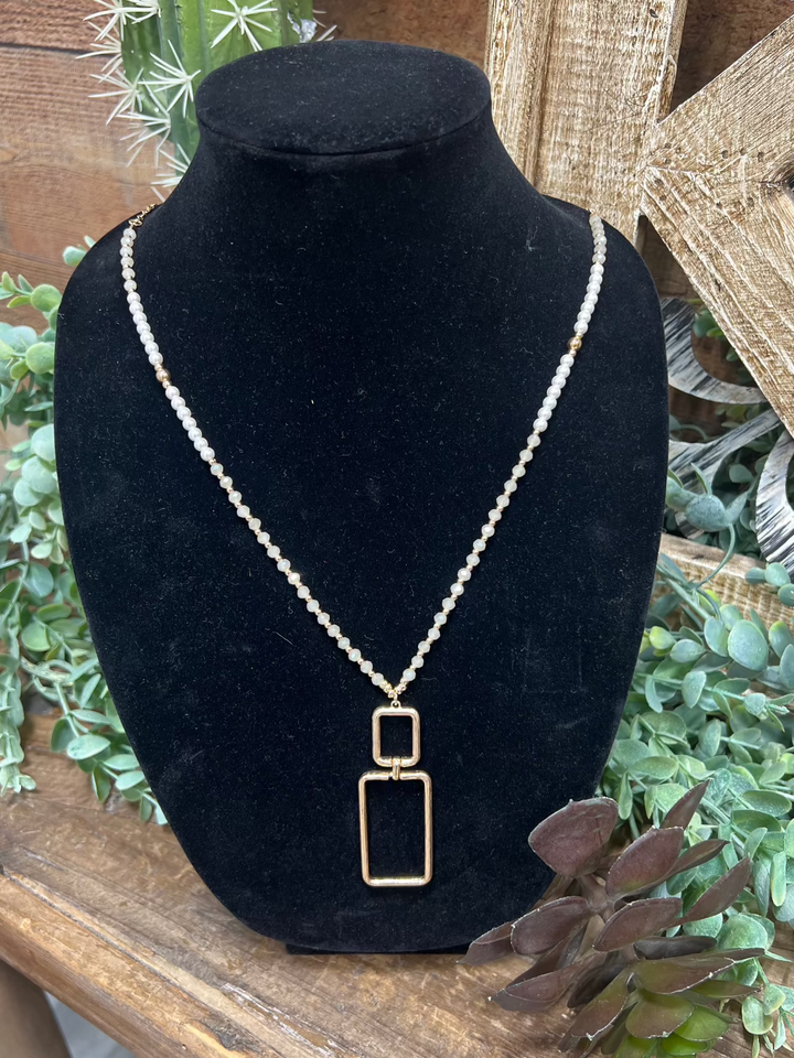 34" Long gold chain with pearl accents and a gold rectangular pendant