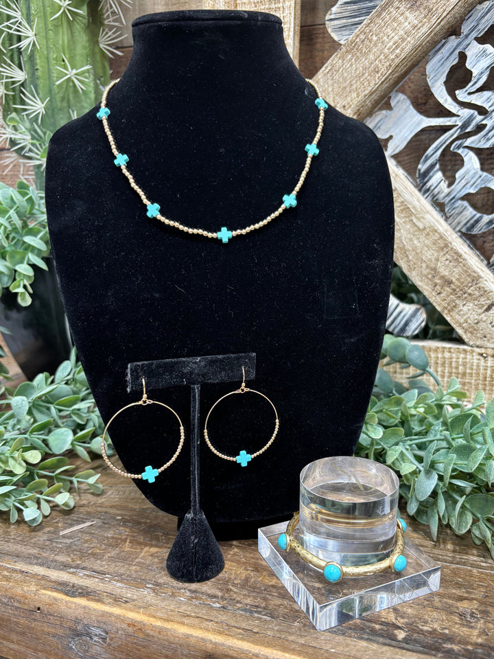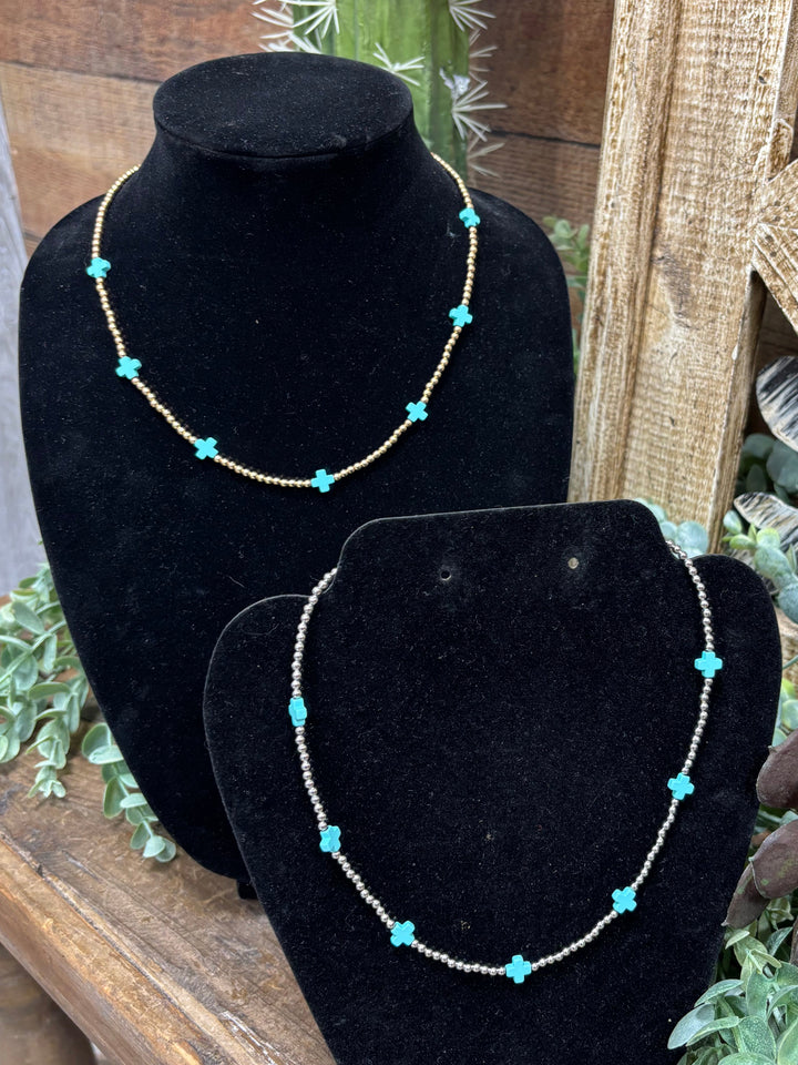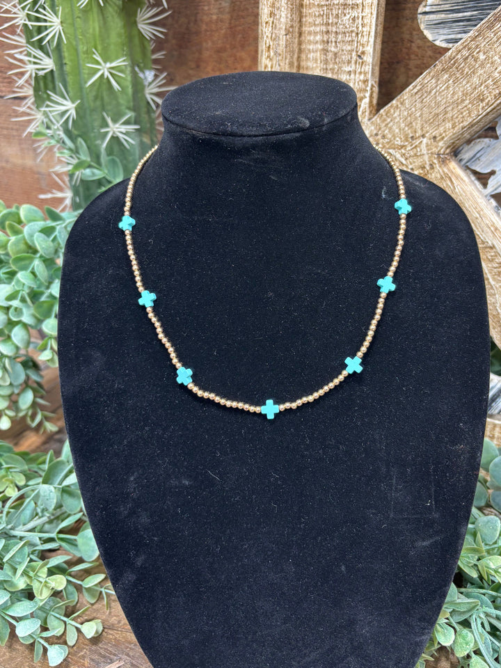 Add some personality to your jewelry collection with this playful beaded necklace adorned with turquoise crosses!