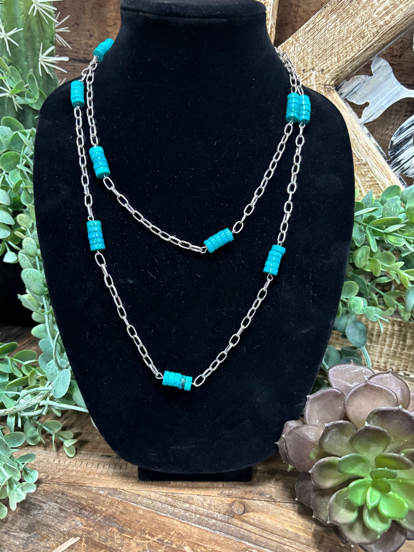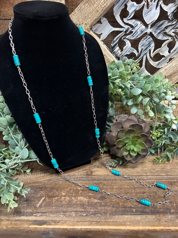 The Tacoma necklace features a silver chain and vibrant turquoise beads.