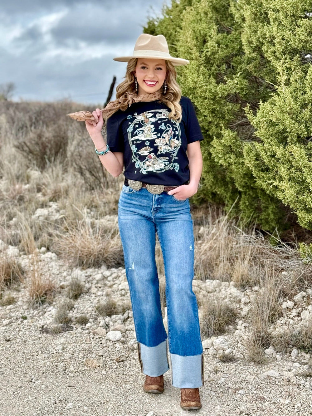 Hand drawn design featuring rodeo cowboy ranch graphics and paisley pattern